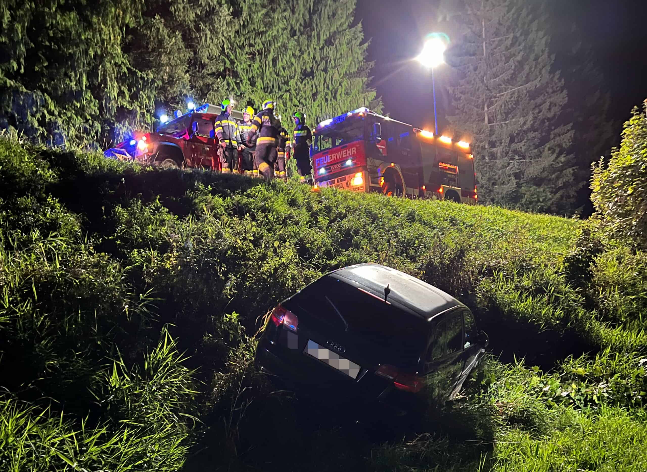Eingetroffen am Einsatzort, die Polizei war bereits vor Ort, fand bot sich folgendes Bild der Lage: Ein Pkw-Lenker verlor aus bislang ungeklärter Ursache die Kontrolle über sein Fahrzeug und kam von der Bundesstraße ab. Versuche das Fahrzeug entlang der Böschung wieder auf die Fahrbahn zurückzulenken waren erfolglos, weswegen die Einsatzkräfte alarmiert worden sind.