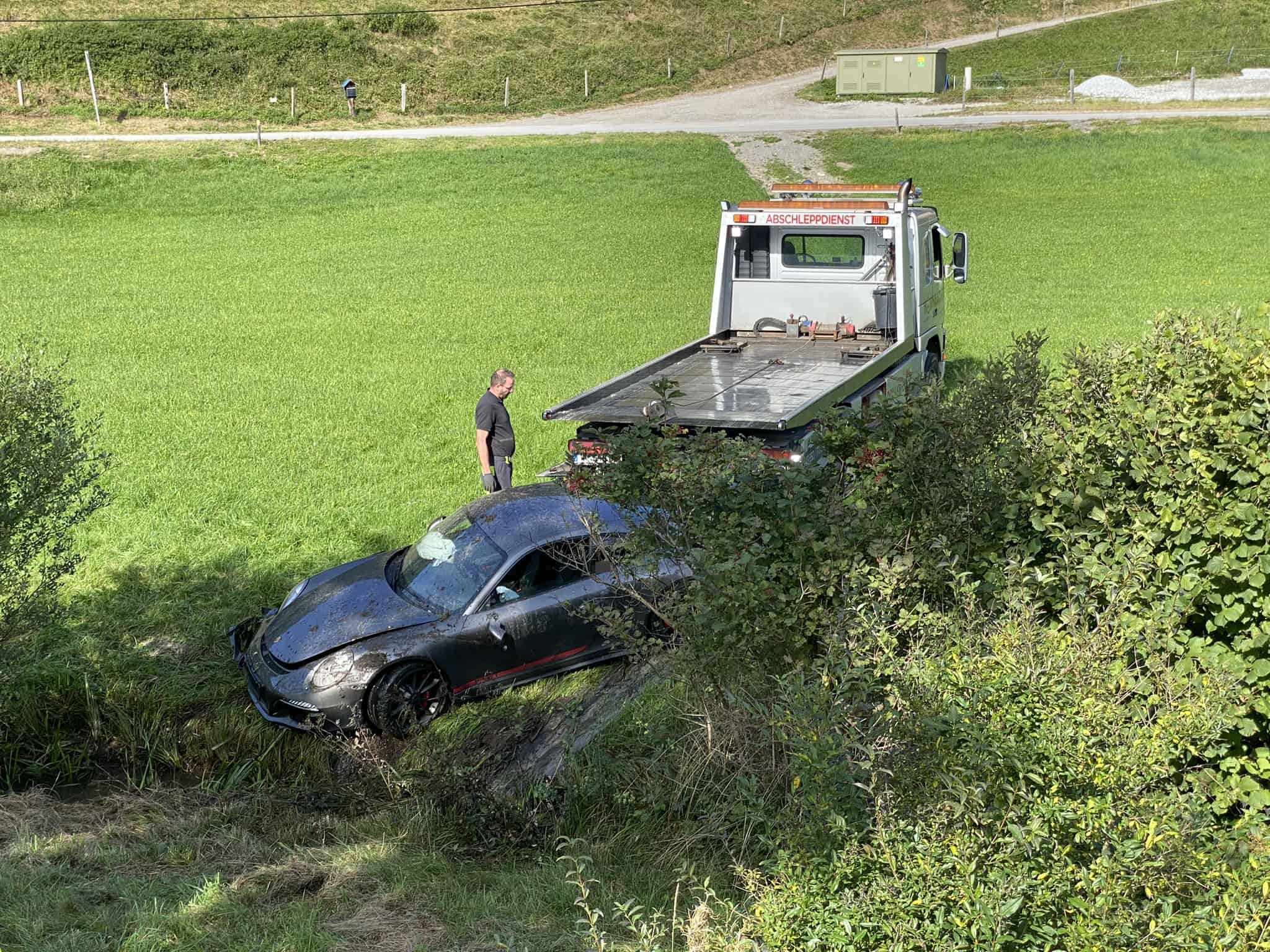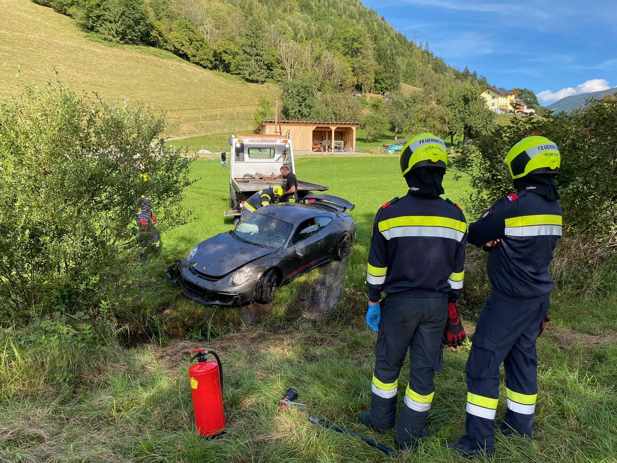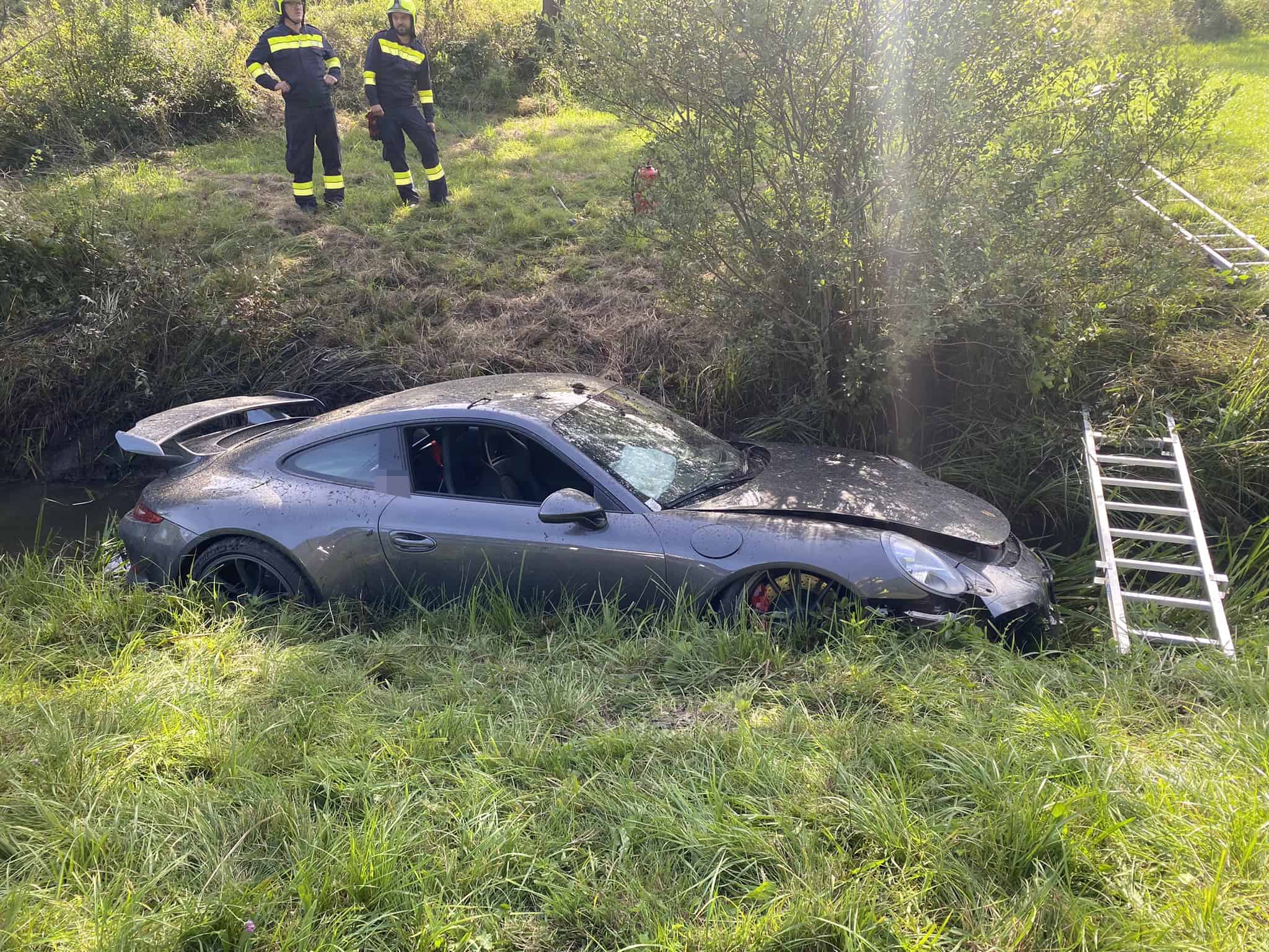 Glücklicherweise, entgegen der ersten Informationen, waren die beiden Insassen bei Eintreffen der Feuerwehr bereits aus dem Fahrzeug befreit und in Obhut von Ersthelfern.