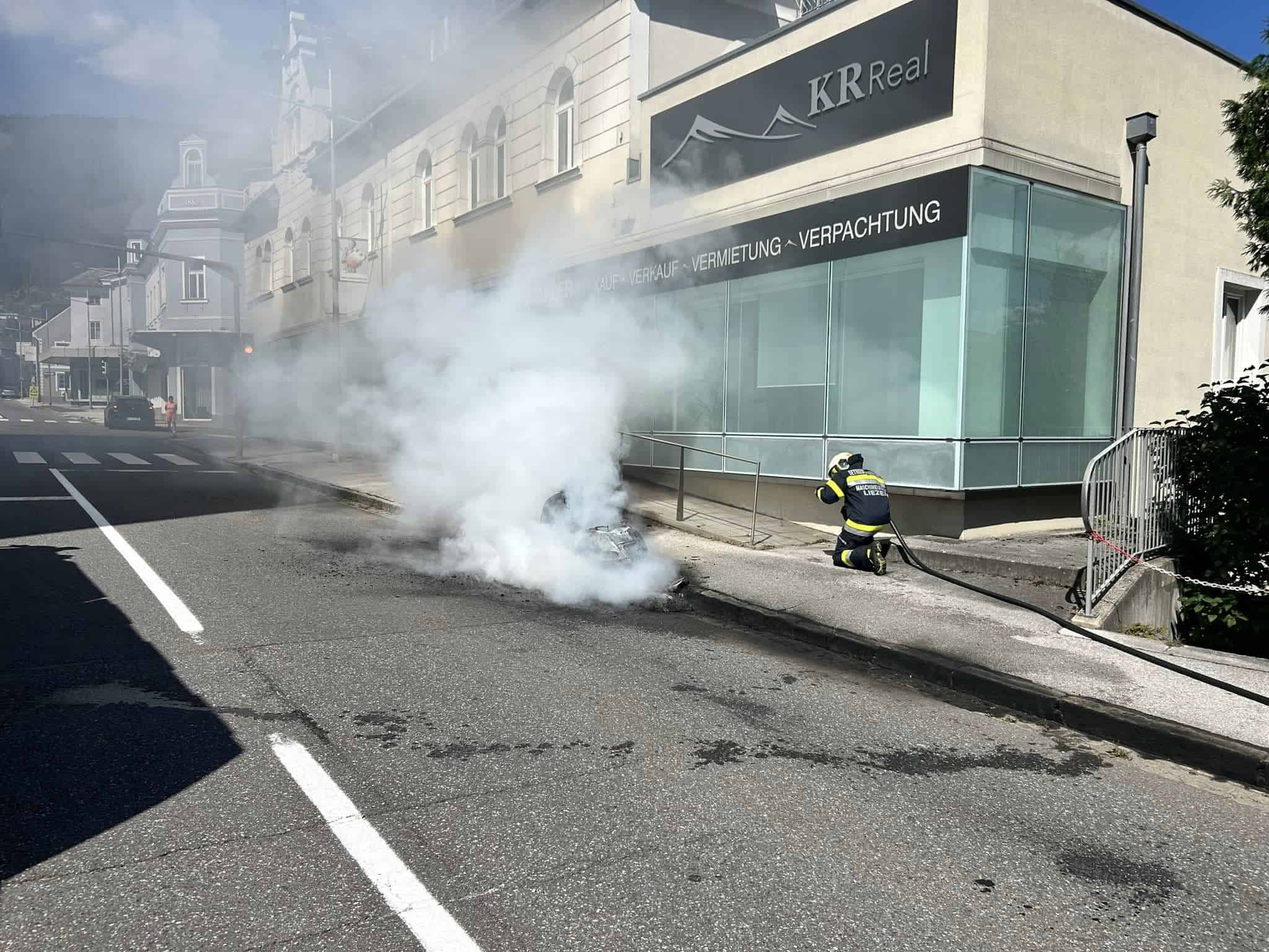 Aus unbekannter Ursache geriet ein Kleinmotorrad in Vollbrand. Da sich Teile der Einsatzmannschaft mit dem Tanklöschfahrzeug noch in Wörschach befanden, wurde die Betriebsfeuerwehr Maschinenfabrik Liezen mitalarmiert. Mit vereinten Kräften konnte der Brand rasch unter Kontrolle gebracht und abgelöscht werden. Die weiteren Arbeiten beschränkten sich auf die Bergung des Motorrades sowie die Reinigung der Fahrbahn von Fahrzeugresten. Verletzt wurde glücklicherweise niemand.